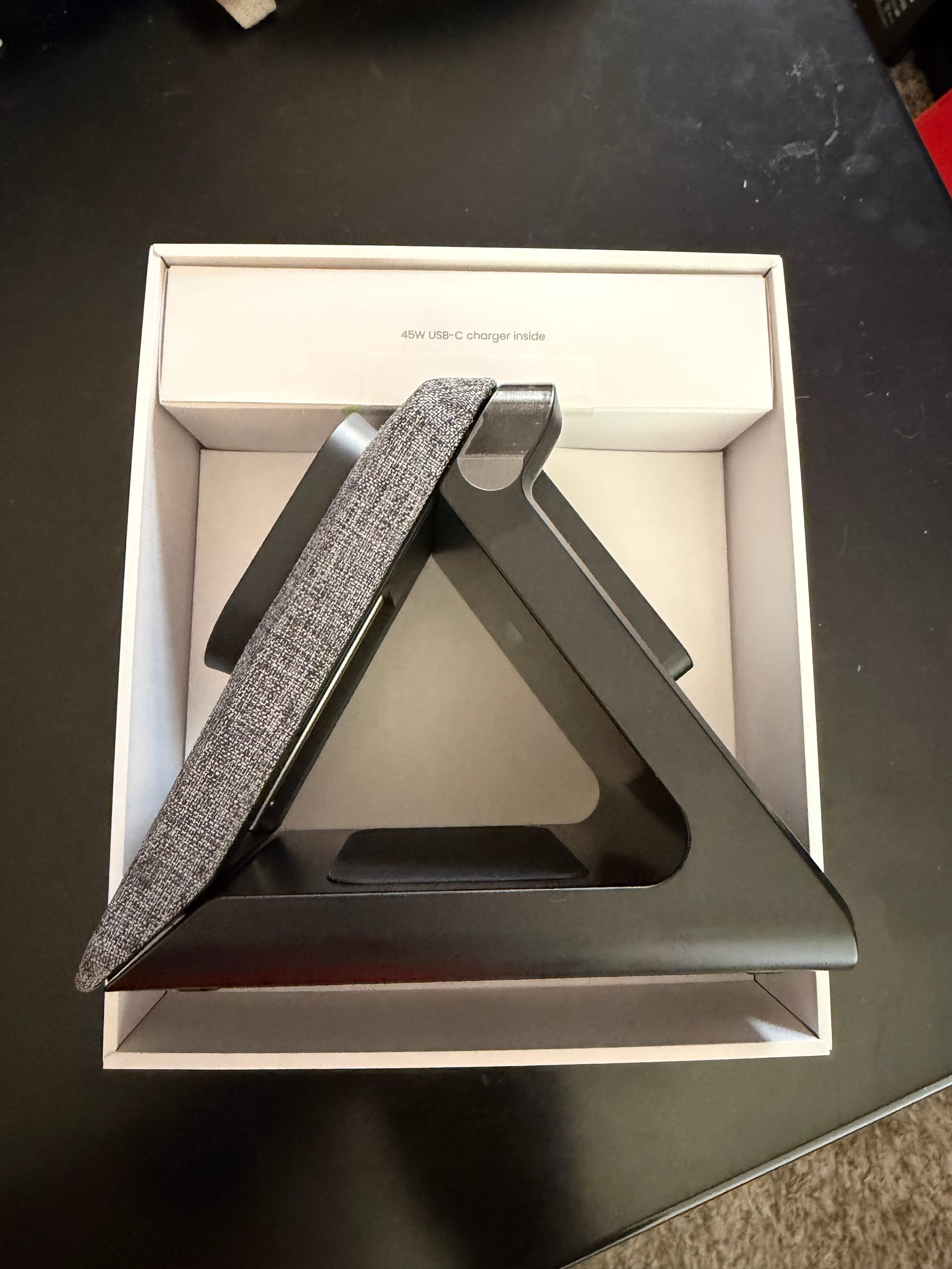 Pick up the Summit Ultra and the first thing you notice is that it's heavy. Not awkward-heavy, but the satisfying heft that communicates genuine build quality before you've even plugged it in. At 614 grams, it doesn't budge. The fabric wrapped front and the triangular vertical footprint give it a design character that's more home decor than consumer electronics accessory, and the neutral grey colorway fits comfortably into any space without announcing itself. That matters more than it sounds. A charger you leave on your nightstand is part of your room's aesthetic whether you want it to be or not.
